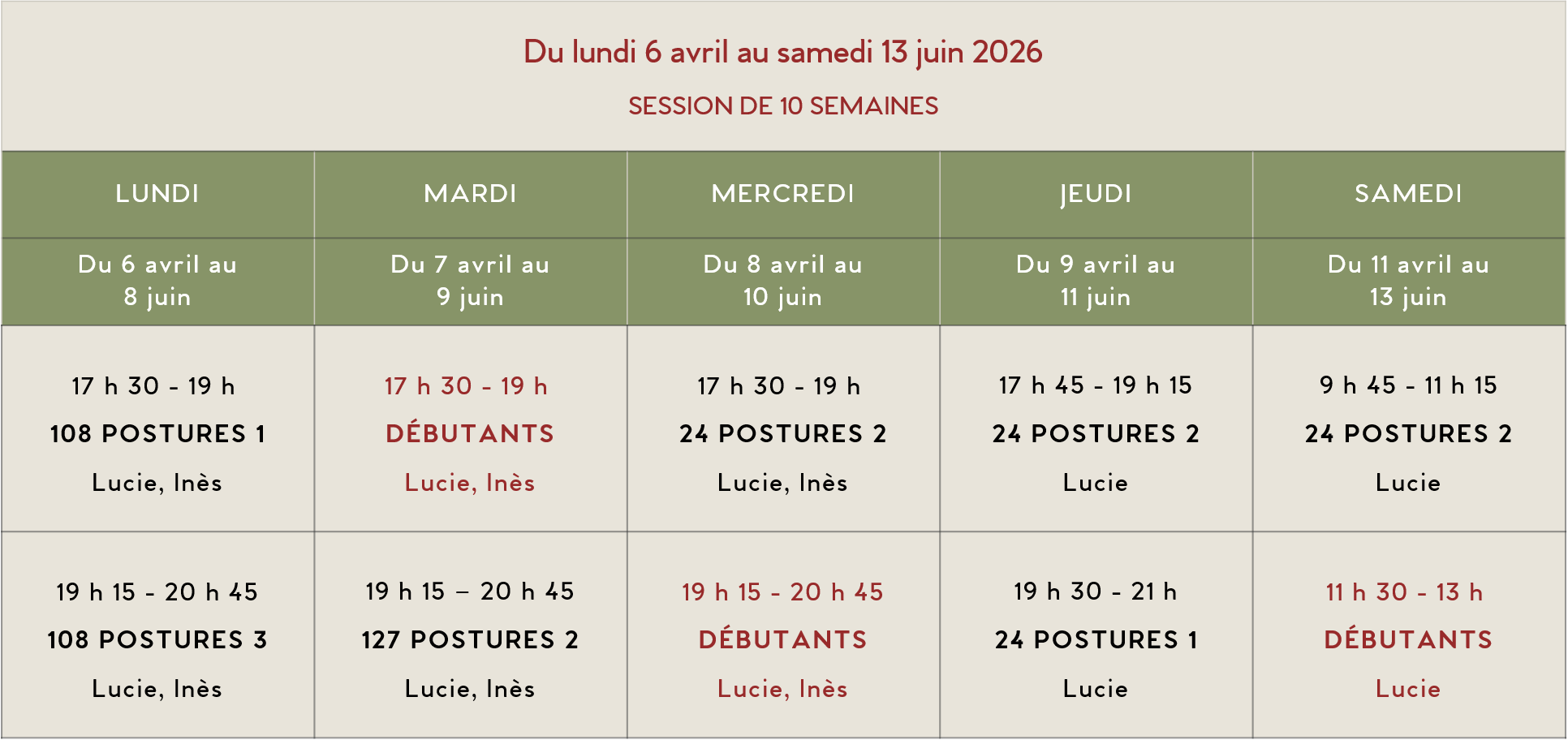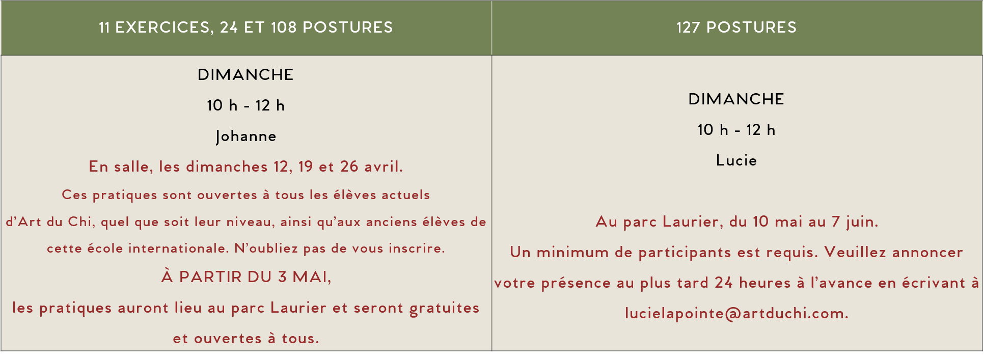 11 exercices, 24 et 108 postures (12, 19, 26 avril)